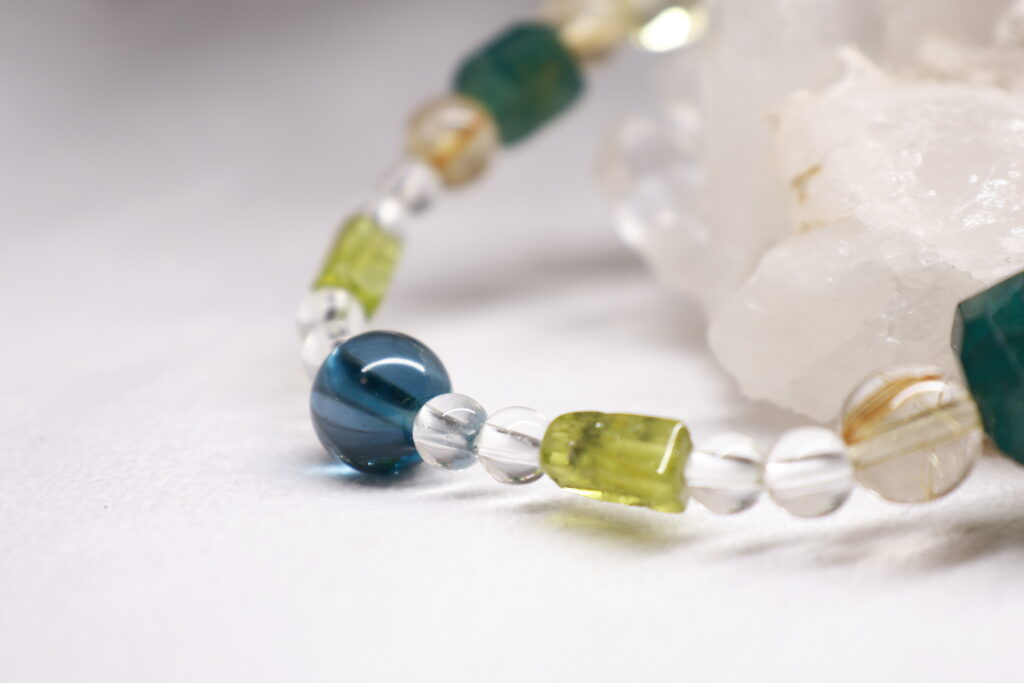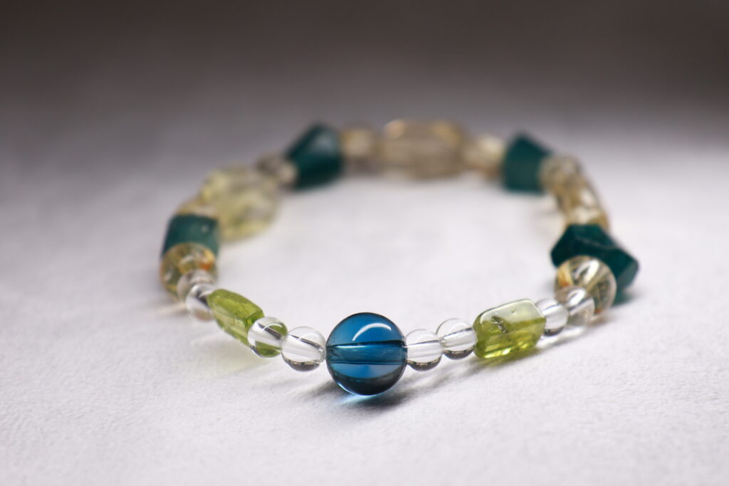 このブレスレットの主役は、ロンドンブルートパーズ。