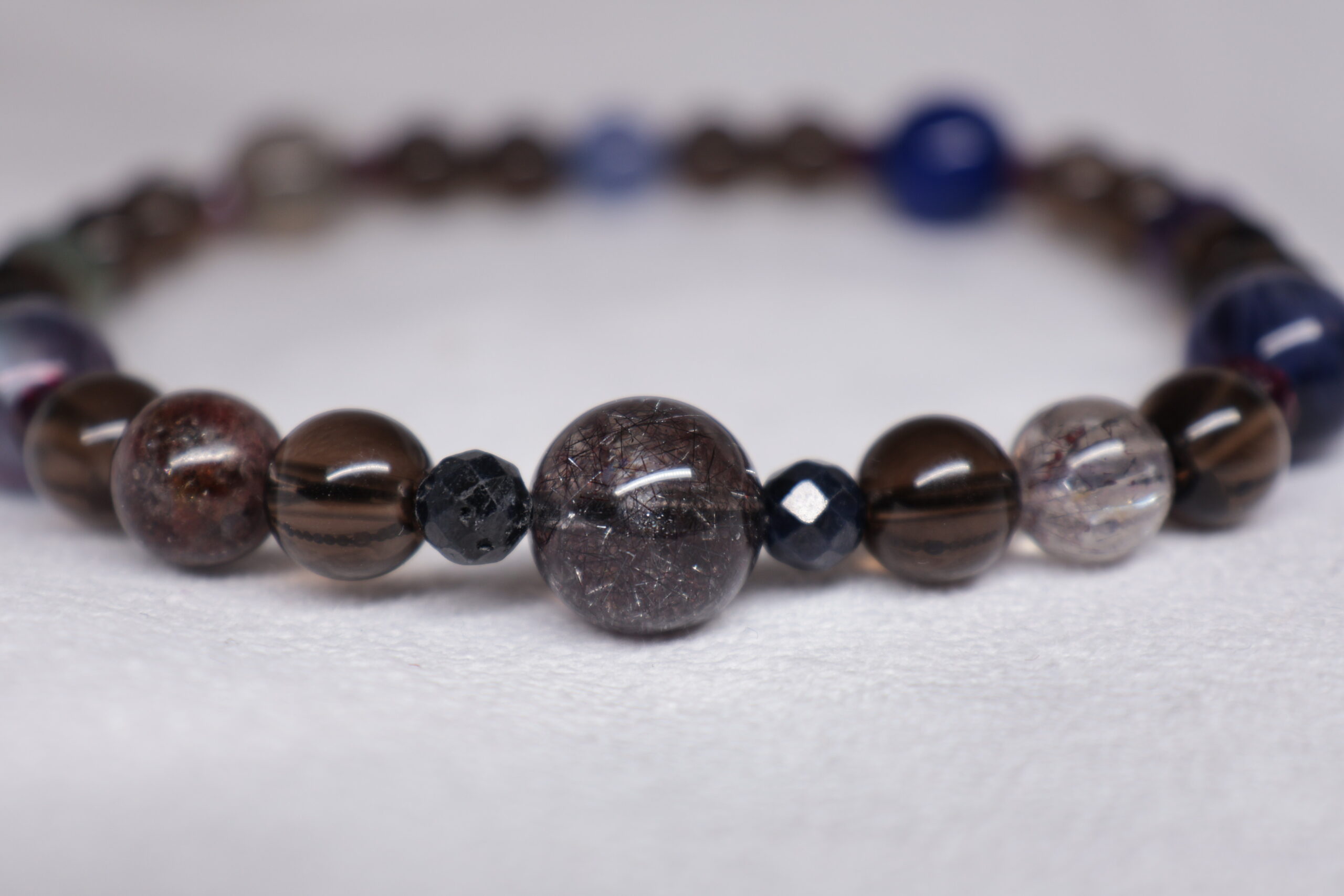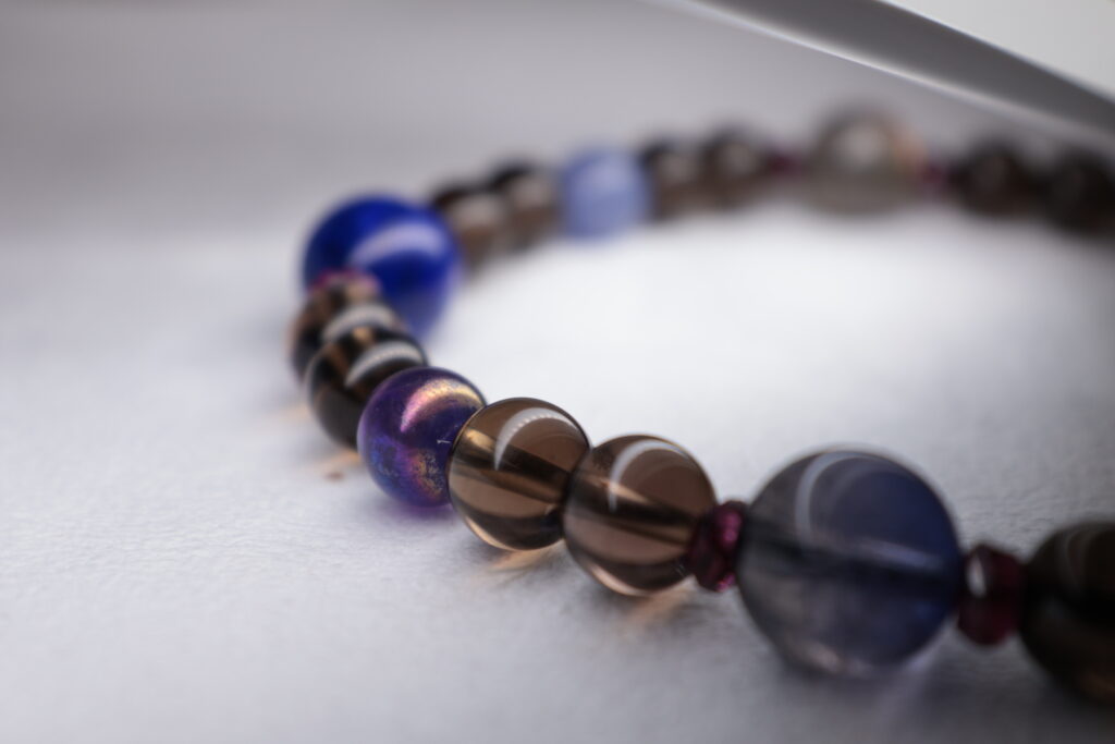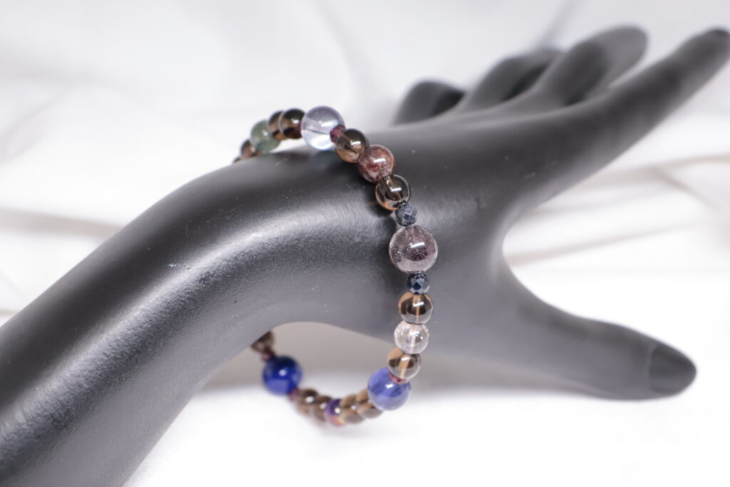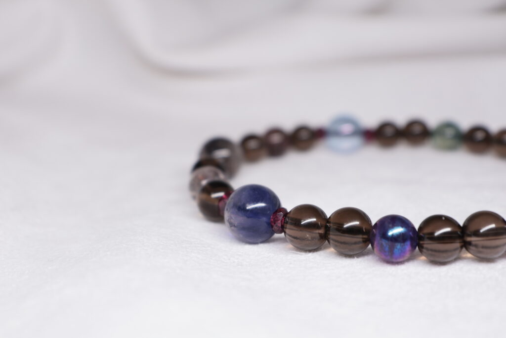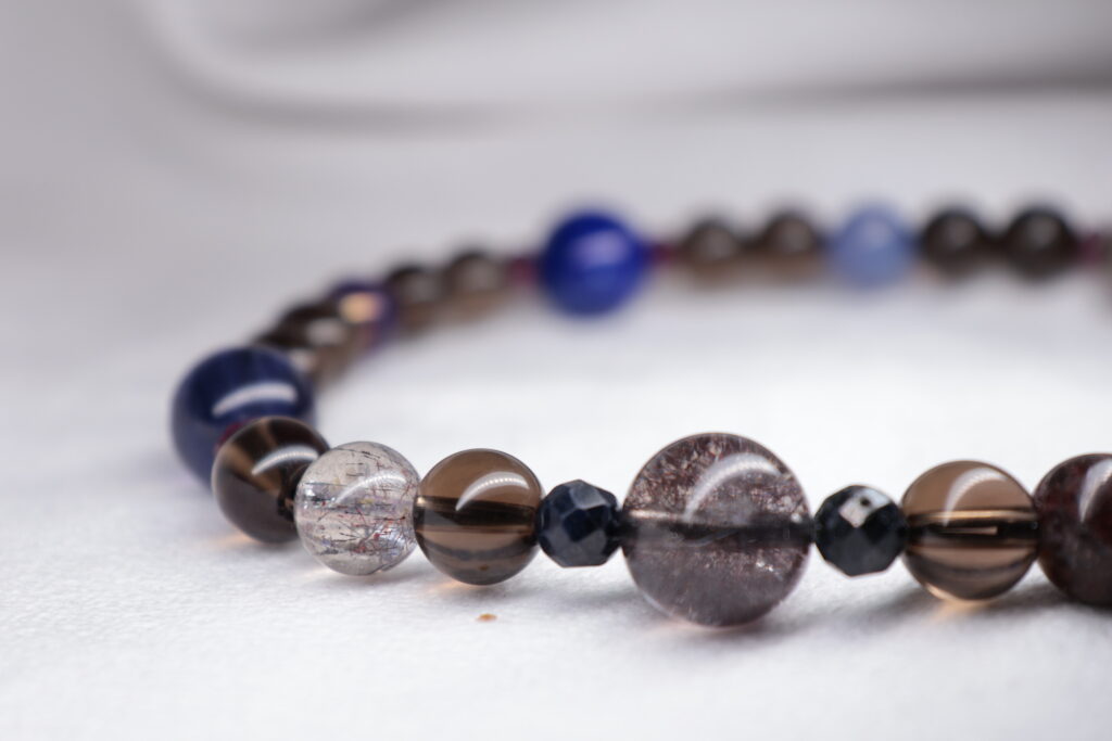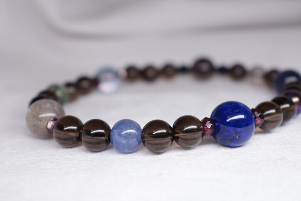 スモーキークォーツのダークブラウンをベースに。 ラピスラズリの深い青。 ガーネットの深い赤。 タンザナイトの青紫。